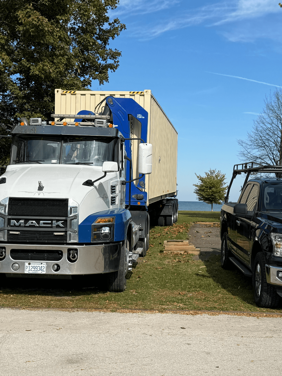 Our sidelifter handled the job smoothly — lifting, transporting, and setting the container exactly where it was needed, all with Lake Michigan’s scenic backdrop in view.