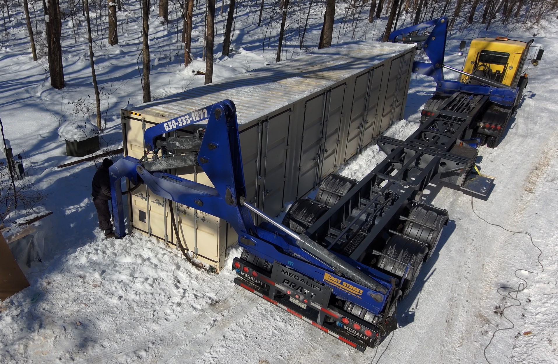 Once secured, the container was transported directly to the Chicago railyard for rail transfer. By combining experienced drivers with the versatility of the Megalift sidelifter, Easy Street Transportation delivered a streamlined, cost-effective solution — proving that even remote winter pickups can be completed smoothly with the right equipment.